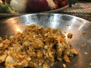 Dins una altra paella torrem la farina tot remenant sense aturar-nos perquè la farina no prengui una color excessivament rossa. A continuació posem la farina torrada i la verdura sofregida tota junta dins una escudella i ho barregem amb l’ou. Salpebrem la mescla a gust nostre.