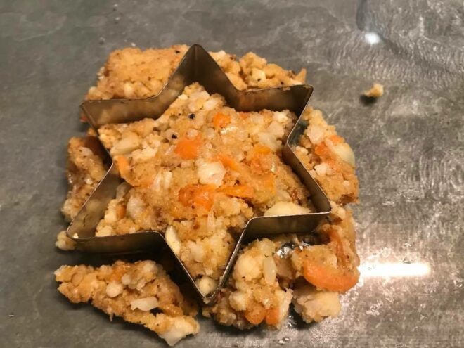 Ara, dins una paella amb oli d’oliva abundant i roent —però que no fumegi pas— hi posem cullerades de la mescla perquè formin una raola [una croqueta esclafada] cadascuna. Altrament, podem tallar la mescla amb els talla-galetes que desitgem per a fer raoles amb forma de Maguèn David [estel de sis puntes], de sevivon [baldufa], de cor, de peix, de khamsa [mà] o de khanukà [khanukià, canelobre de nou braços] i d’aquesta manera fer que les nostres raoles siguin més originals i divertides. Quan les raoles hauran agafada coloreta per totes dues bandes, les retirem sobre un paper absorbent.