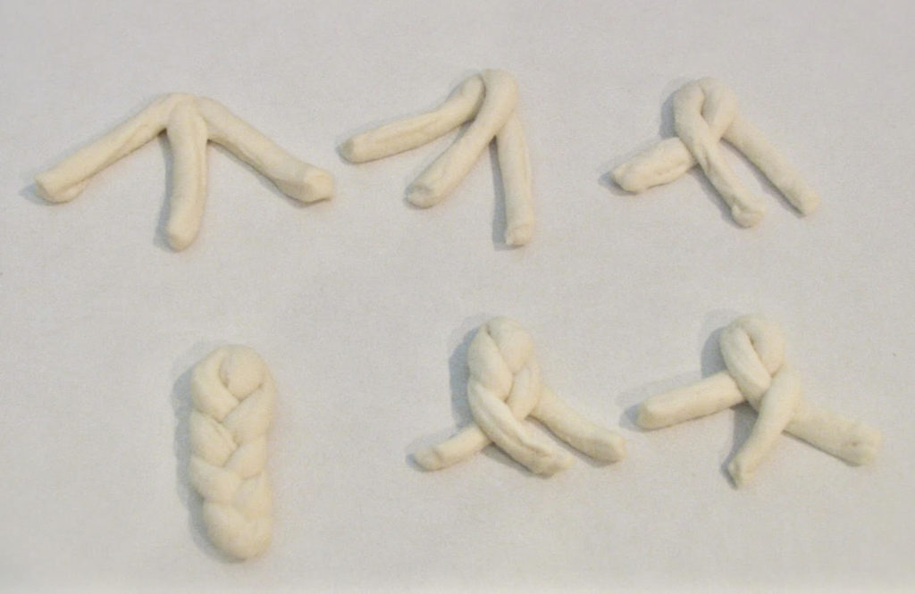 - Amb cadascuna de les porcions farem 3 xurros tot mirant que tots siguin més o menys del mateix gruix i llargada i amb els quals farem unes mini trenelles.